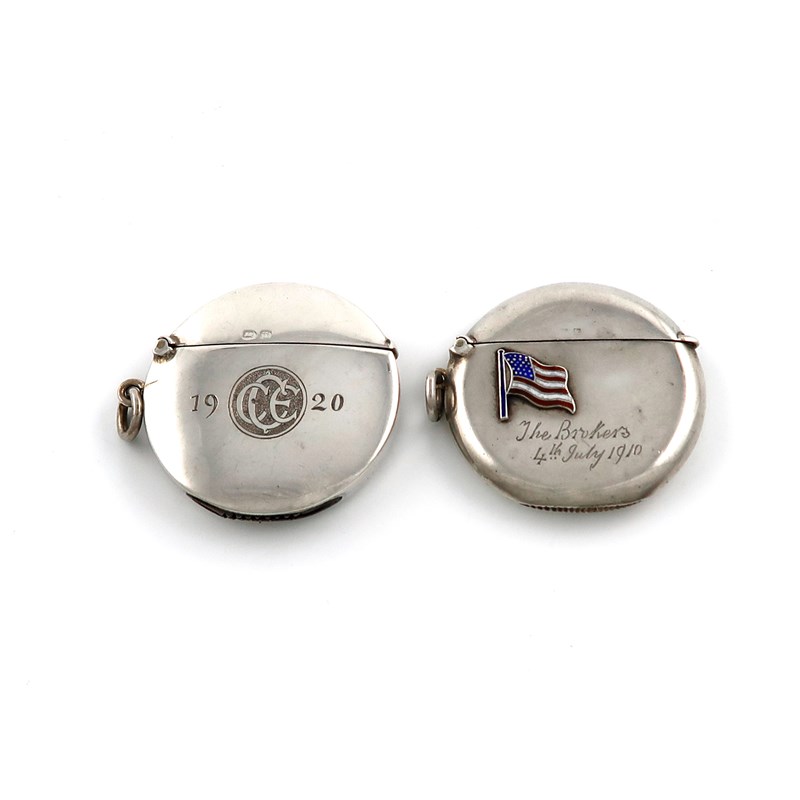 circular form, hinged cover with a ring attachment, the front applied with an enamelled stars and stripes flag, and inscribed 'The Brothers 4th July 1910', diameter 4.5cm, plus another circular silver vesta case, Birmingham 1919, the front initialled 'C.C.E', approx. total weight 1.3oz. (2)