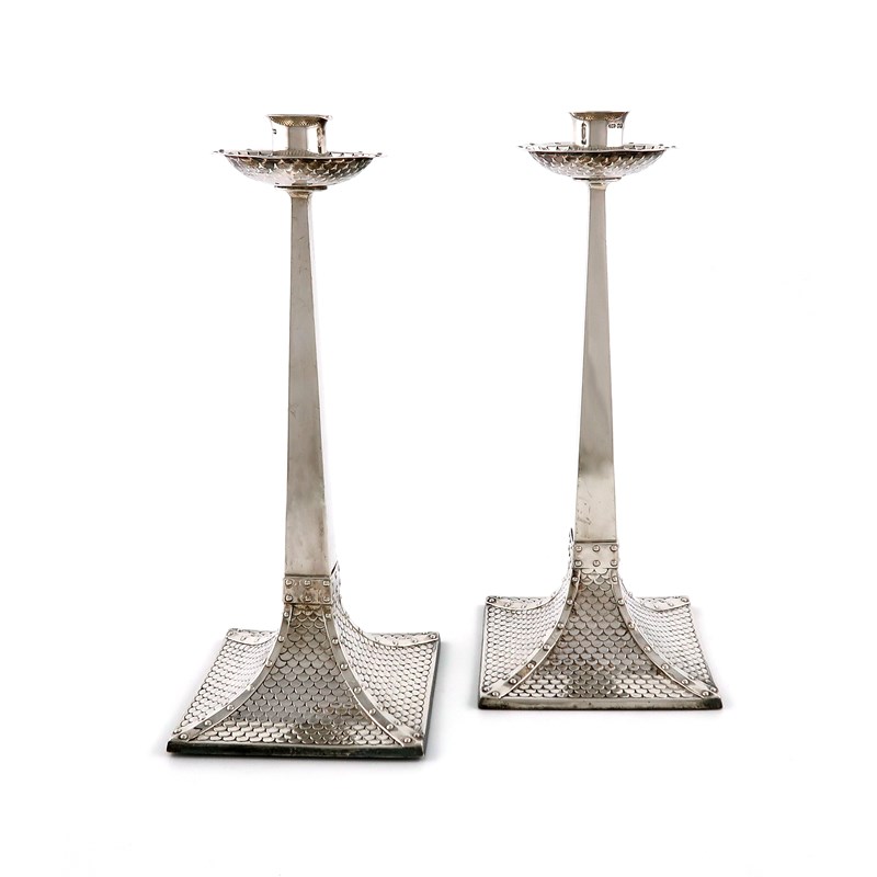 A pair of Edwardian silver Arts and Crafts candlesticks