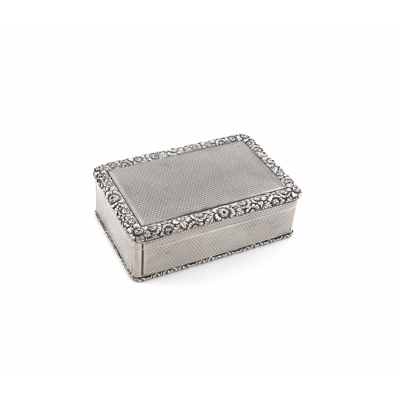 rectangular form, engine-turned decoration, foliate scroll borders, gilded interior, length 9.7cm, approx. weight 7.9oz.