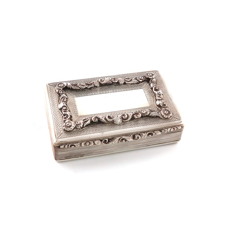 rectangular form, engine-turned decoration, reeded sides, the hinged cover with a raised foliate scroll border, gilded interior, length 8.9cm, approx. weight 5.2oz.