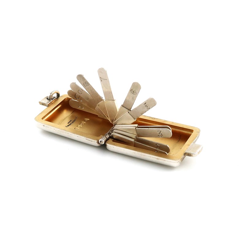 rectangular form, the hinged cover opens to reveal a fan of twelve unmarked numbered place finders, with a ring attachment, length 4.7cm, approx. weight 1.8oz.