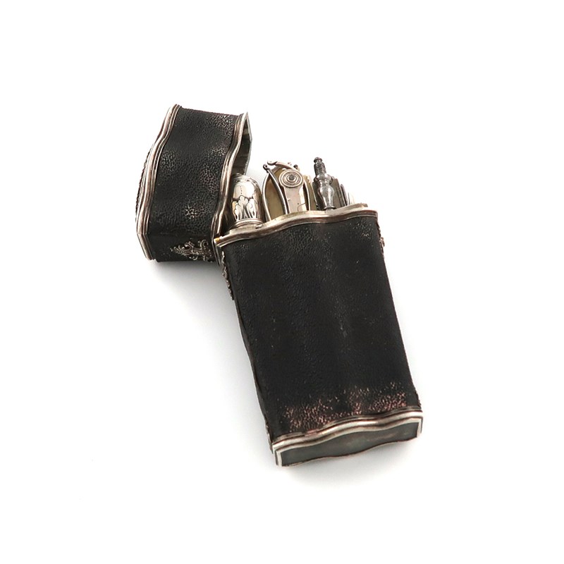 tapering shaped rectangular form, plain mounted, the inside of the hinged cover engraved with a mask and foliate decoration, the interior fitted with an ivory sleeve, two tapering knife/fork handles, two steel knife blades, a two tined fork, a pair of scissors, a pair of tweezers and ear/dental scraper, a ruler, a pair of compasses, a bodkin, and a pencil, length closed 8.7cm.