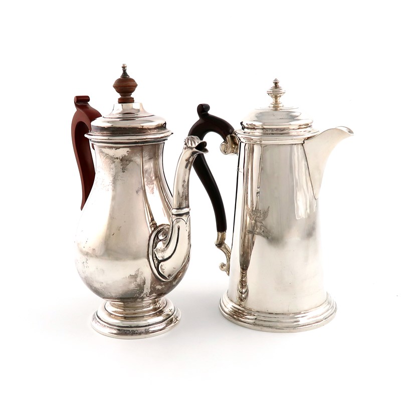 baluster form, scroll handle, on a circular foot, height 21.5cm, plus a silver hot water pot, by Martin, Hall and Company, date letter worn, tapering circular form, engraved with a crest, approx. total weight 25.5oz. (2)