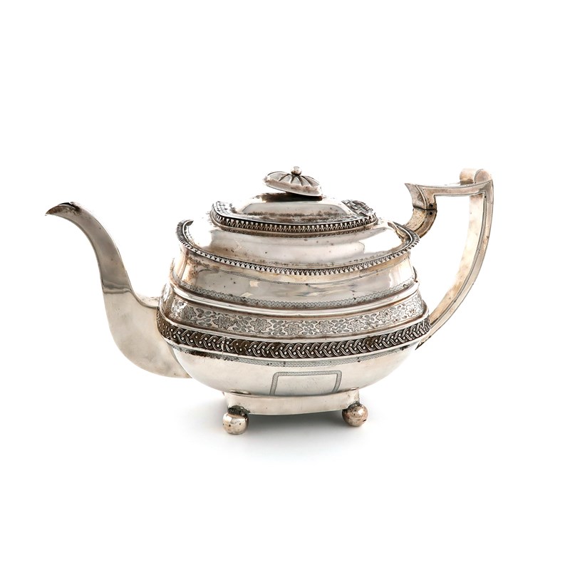 rounded oblong form, chased foliate and scroll decoration, raised hinged cover, on four ball feet, scroll handle (detached), length handle to spout 29cm, approx. weight 22.7oz.