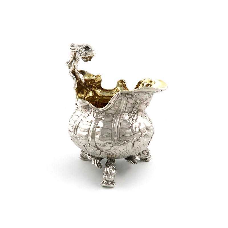 oval bellied form, wavy edge scroll border, the handle with a mask terminal, and the spout supported by a mermaid mask, with foliate decoration, on three mythical dolphin feet, height 12.5cm, approx. weight 8oz.
