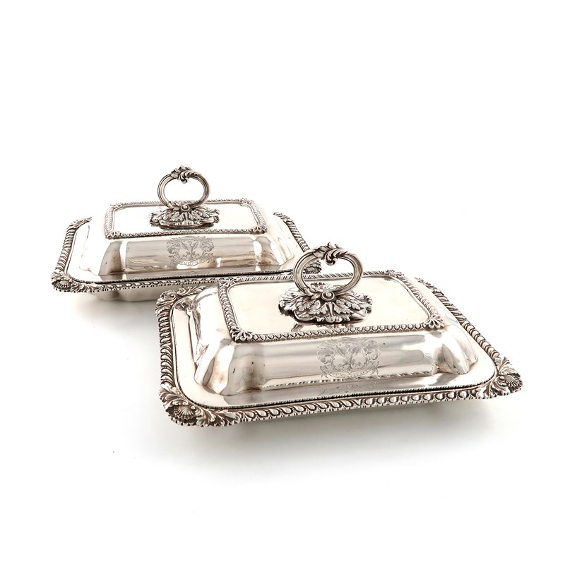 rectangular form, gadroon and shell borders, the raised covers with detachable foliate scroll handles, and engraved twice with a crest and motto within foliate scroll mantling, numbered '3' and '4', the handles '1' and '2' length 31cm, approx. weight 135oz. (2)