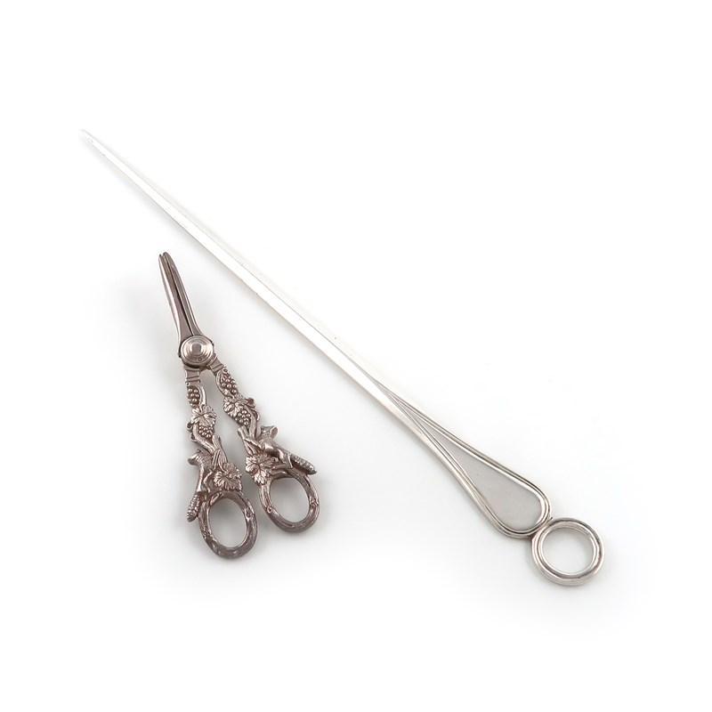 reeded ring terminal, length 36cm, plus a pair of modern grape scissors, by I. Freeman and Son, Sheffield 1964, with running fox and grapevine handles, approx. weight 8.4oz. (2)