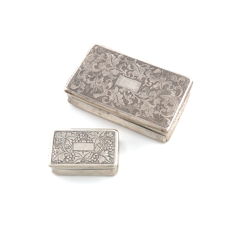 rectangular form, the hinged cover and base with chased foliate scroll decoration on a matted background, with a vacant cartouche, plain sides, length 7.5cm, plus a smaller Chinese silver snuff box, by Hung Chong, the cover with vine decoration, length 4.2cm, approx. weight 3oz. (2)