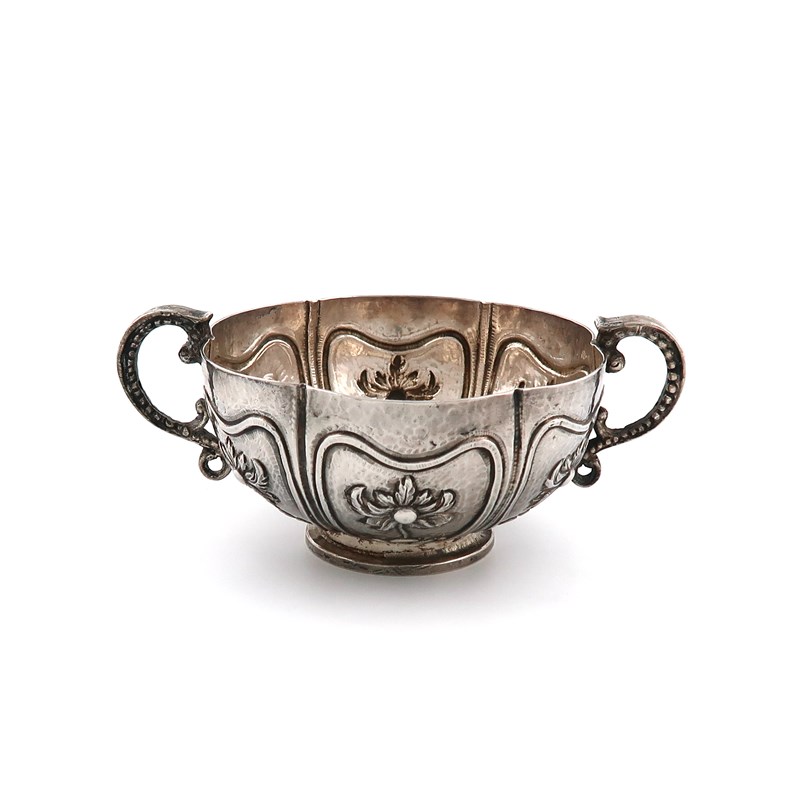 lobed circular form, embossed with flowers on a matted background, scroll handles, on a raised circular foot, length handle to handle 14.2cm.