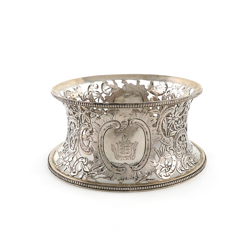 tapering circular form, pierced and chased foliate scroll and foliate estimate, with an upper and lower beaded border, engraved with a crest, the reverse with initials, diameter of base 19cm, approx. weight 14.5oz.