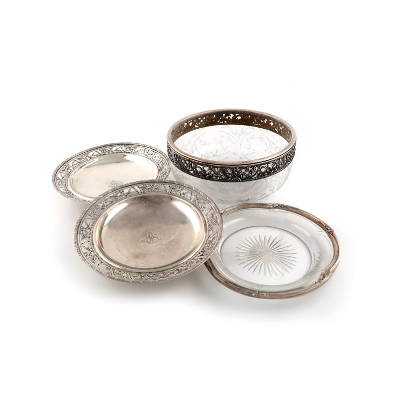 circular form, ribbon and reed border, pierced with foliate decoration, the centres with a monogram, on circular bases, diameter 22cm, plus a French silver-mounted glass bowl, pierced mount engraved glass body, and a silver-mounted glass dish, approx. weighable 20.5oz. (4)