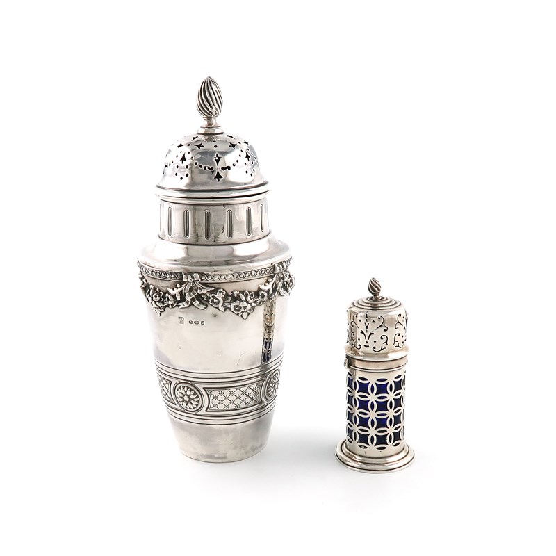 tapering circular form, foliate and rosette decoration, the pierced cover with a spiral fluted finial, height 20.5cm, plus a silver pepper pot, Chester 1904, approx. weight 9oz. (2)