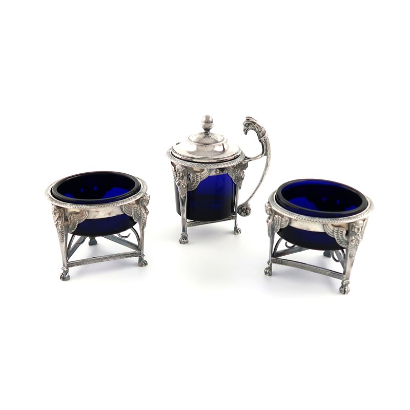 circular form, the handle with a bird's head finial, hinged cover, on three Sphinx head mounted legs on paw feet, with a blue glass liner, plus a pair of French silver salt cellars, post 1838, circular form, on four Sphinx head mounted legs on paw feet, with blue glass liners, approx. weighable 10oz. (3)