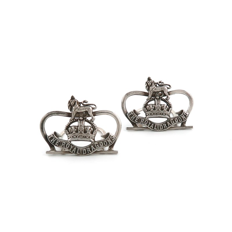 A pair of Scottish Regimental silver menu card holders, The Royal Dragoons,