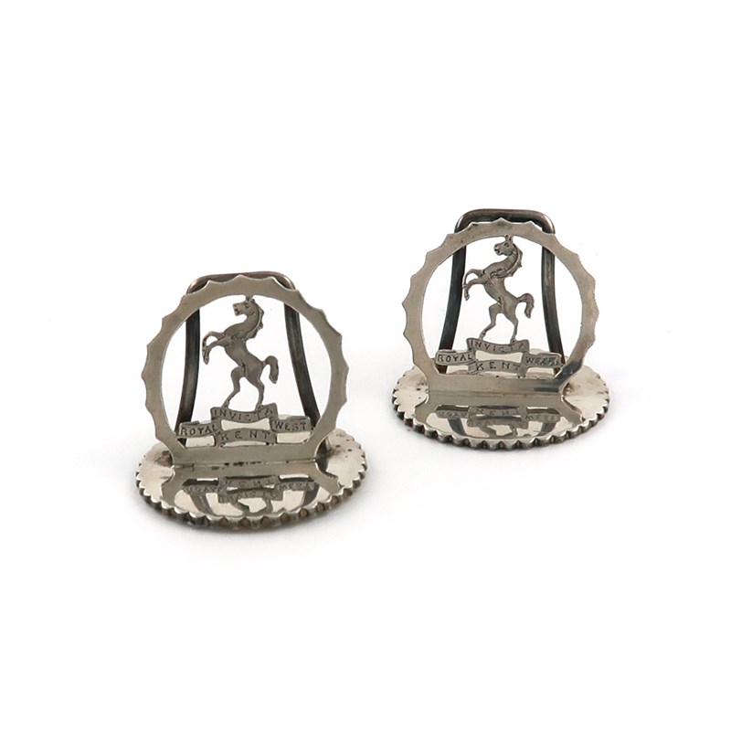 A pair of Regimental silver menu card holders, The Queen's Own Royal West Kent Regiment,