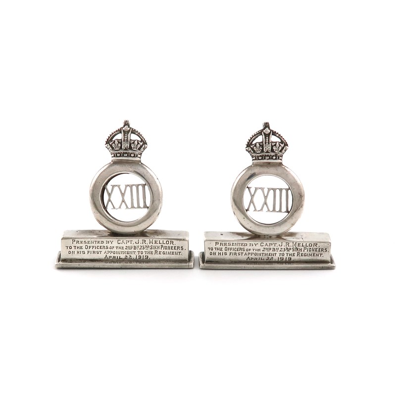 modelled as the regimental badge, on raised rectangular weighted bases with wire-work supports, inscribed 'Presented by Capt. J.R. Mellor to the Officers of the 2nd Bn 23rd Sikh Pioneers on his appointment to the Regt. April 22, 1919', length 6cm. (2)