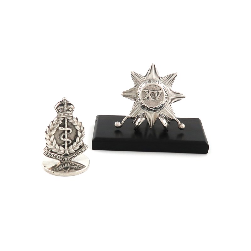 modelled as the regimental badge, on a wooden base, length 8.6cm, plus a Regimental electroplated menu card holder, The Royal Army Medical Corps, (RAMC), on a circular base, height 4.8cm. (2)
