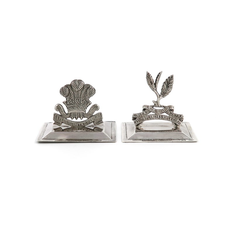 modelled as the regiment badge, on rectangular bases, length 5.4cm, approx. weight 1.7oz. (2)