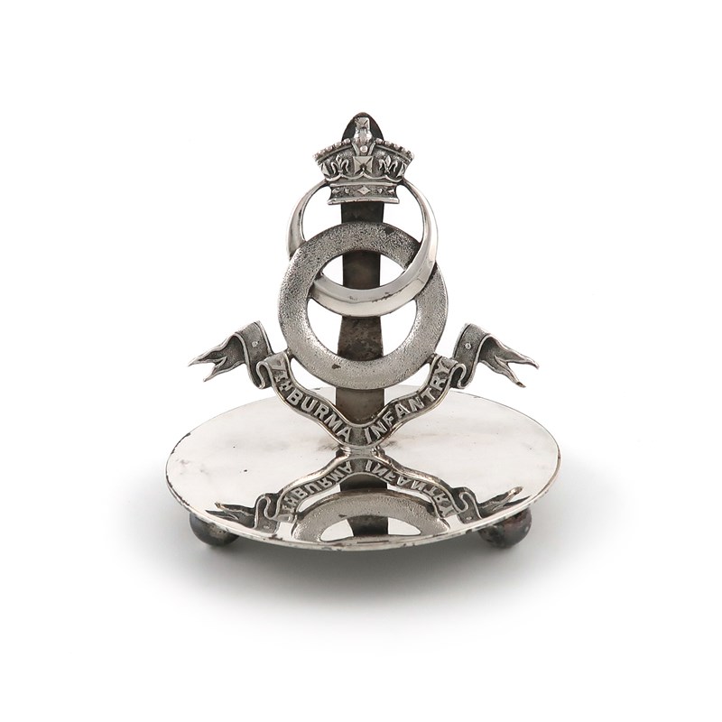 A late-Victorian Regimental electroplated menu card holder, The 29th Regiment (7th Burma Battalion) Madras Native Infantry,