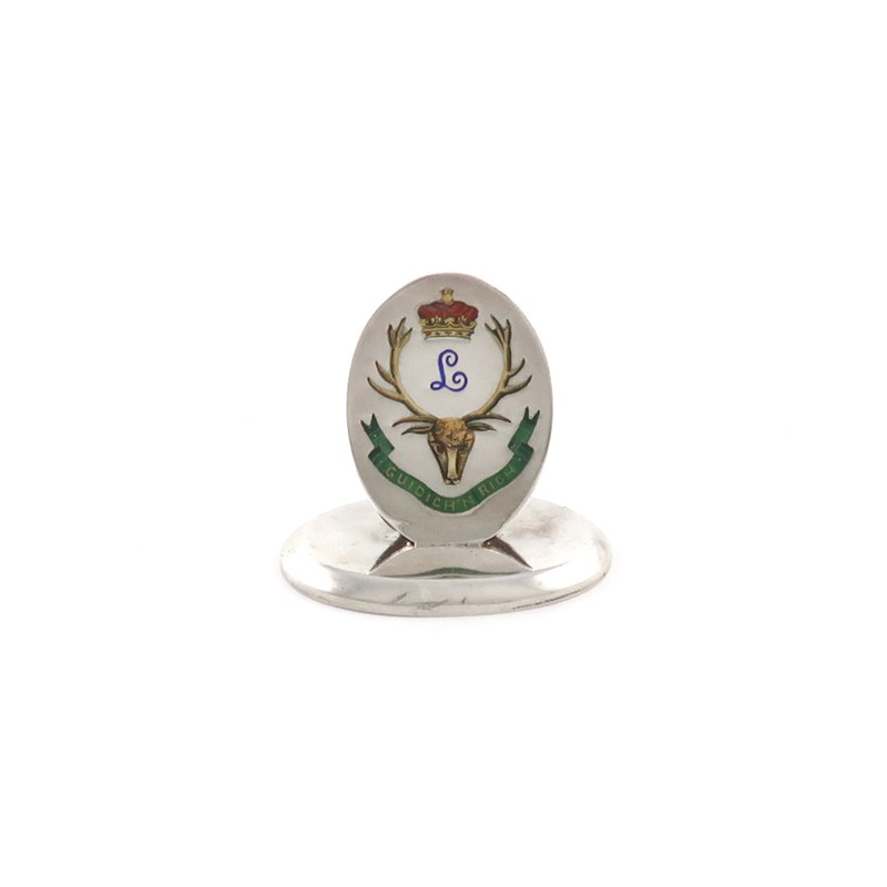 oval form, enamelled with the regimental badge with the cipher 'L' for Prince Leopold, Duke of Albany, on an oval base, height 4.2cm, approx. weight 0.4oz.