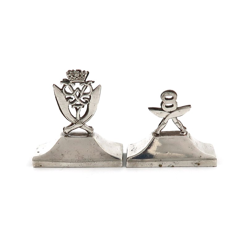 modelled as the regimental badge on a raised weighted rectangular base, height 5cm, plus another Regimental electroplated menu card holder, The 8th Gorkha Rifles, height 3.7cm. (2)