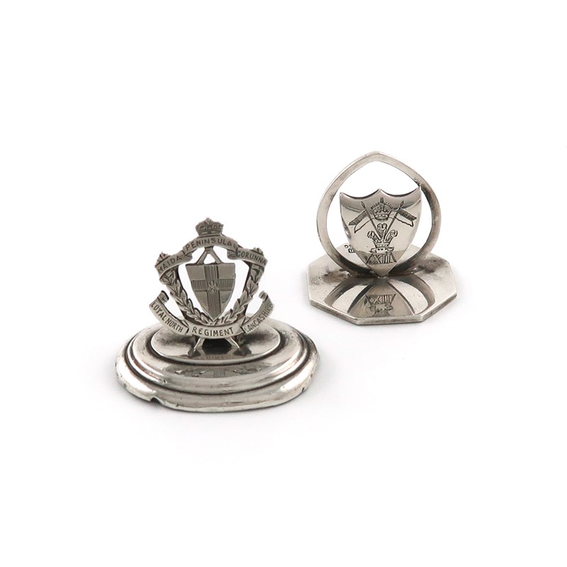 modelled as the regimental badge, on an octagonal base, plus an unmarked Regimental menu card holder, The Loyal North Lancashire Regiment, approx. weighable 0.7oz. (2)
