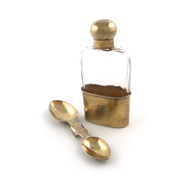 A French silver-gilt spirit flask and double medicine spoon,
