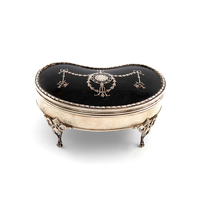 kidney form, the hinged cover inlaid with swags and foliate decoration, husk border, on four pierced bracket feet, velvet lined, length 15.3cm.