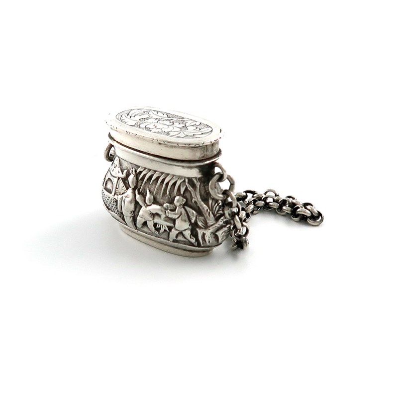 oblong bag form, chased with figural scenes in a landscape setting, the hinged cover with chased foliate scroll decoration, the interior with a pierced foliate grille, with a chain, length 3.8cm.