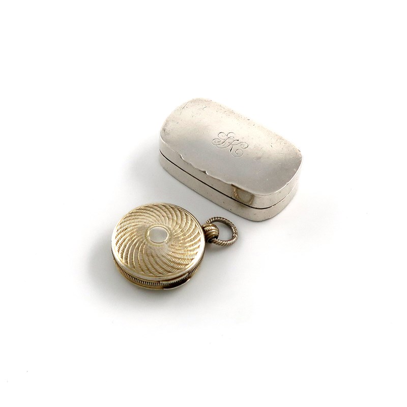 plain rounded rectangular form, the hinged cover initialled, the interior with a plain pierced silver-gilt grille, plus a George IV silver-gilt watch case vinaigrette, by Corfield and Co., Birmingham 1825, circular form, spiral engine-turned decoration, approx. total weight 1.1oz. (2)