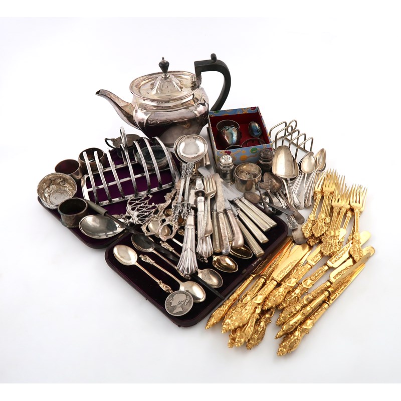 comprising silver items: two spoons with galleon handles, two tablespoons, nine cased Apostle teaspoons, two continental spoons, four napkin rings, a caddy spoon, a Scottish oyster fork, four condiments, a set of six grapefruit spoons, a punch ladle, and other items of flatware, plus electroplated items: a toast rack, a set of electro-gilded fruit eaters, a tea pot, and other items, approx. weighable 25oz. (qty)