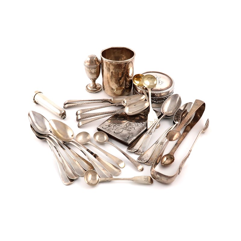comprising: a set of six George III Feather-edge with shoulders pattern teaspoons, two pairs of sugar tongs, a cigarette holder case, a pepper pot, and five salt spoons, plus French items: ten teaspoons, a suite of three stacking beakers, unmarked, initialled, a circular pot, and a Russian note pad, the cover with foliate decoration, approx. weighable 26oz. (qty)