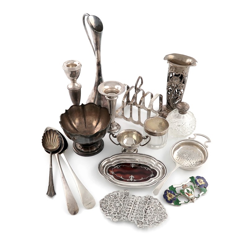 comprising: a Victorian nurse's buckle, by Nathan & Hayes, Chester 1898, pierced foliate and cherub mask decoration, a five bar toast rack, by Viner's Ltd, Sheffield 1933, a lemon strainer, two tablespoons, a small trophy bowl, a dessert spoon with shell bowl, a small candlestick, a circular glass dressing table pot with pull-off cover, a Danish vase with a slender neck, two other vases, one with pierced foliate decoration, a cut-glass dressing table bottle, screw-off cover, a small bowl with fluted rim, a silver mounted tortoiseshell dressing table dish, plus a brooch, stamped Sterling, enamelled with violets, ribbons, a crown and a leaf, approx. weight 18.6oz. (16)