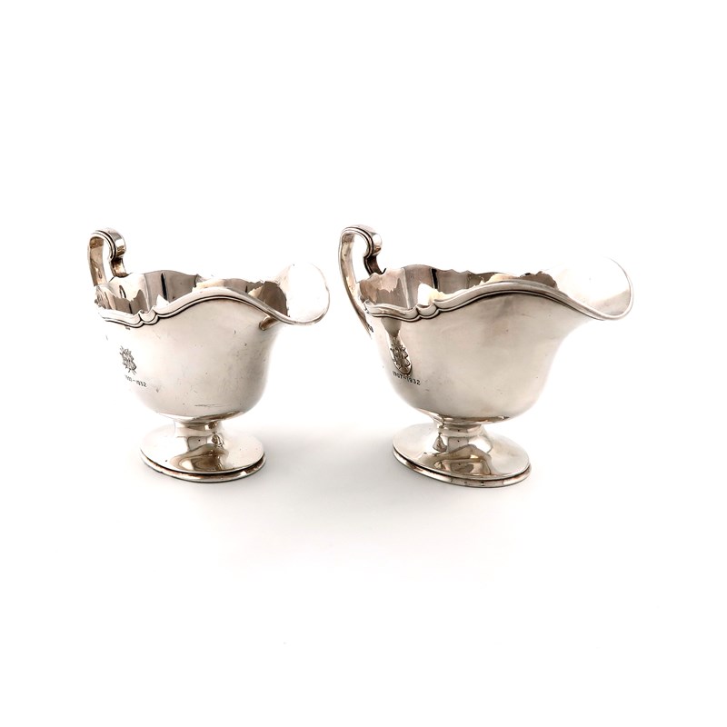 oval form, moulded border, scroll handles, on raised oval bases, inscribed with initials and '1907-1932', length 15cm, approx. weight 11.6oz. (2)