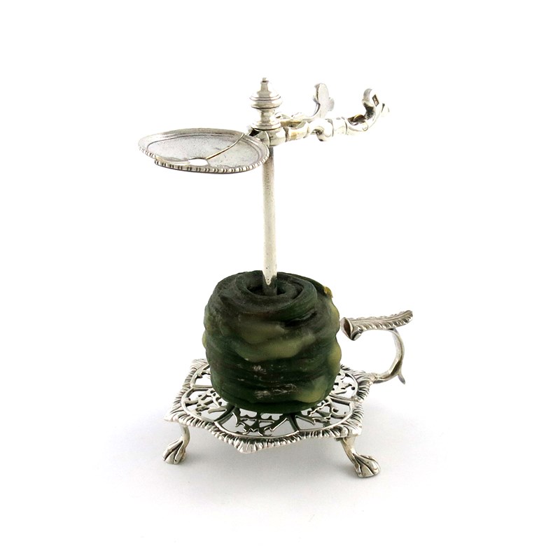 on a shaped circular base with pierced scroll decoration, gadroon border, the carrying handle with a feather-edge thumb-piece, with scissor-action cutter and drip pan, on three claw pad feet, engraved with a crest, height 14.5cm, approx. weight 6.8oz.