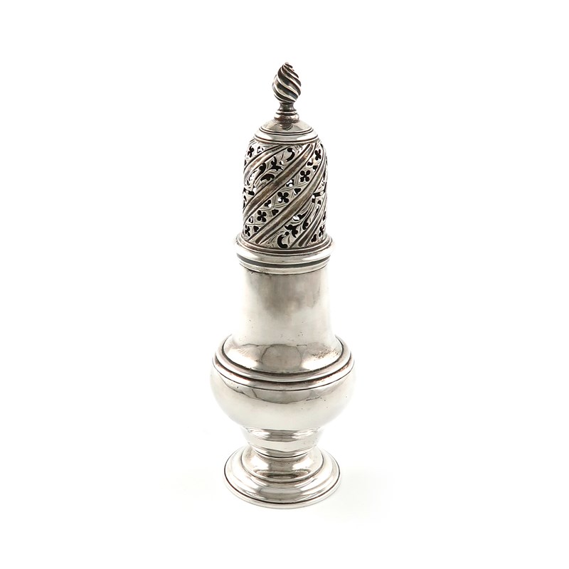 baluster form, the pull-off cover with pierced decoration and with a flame finial, on a raised circular foot, height 20cm, approx. weight 8oz.
