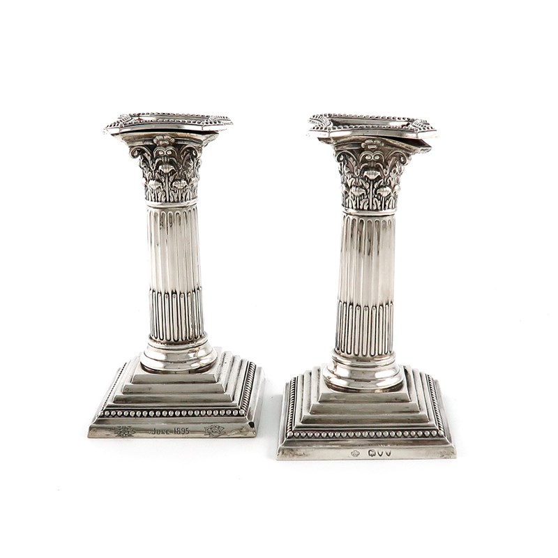 Corinthian column form, beaded borders, on a stepped square base, inscribed, heights 14.5cm and 15cm. (2)