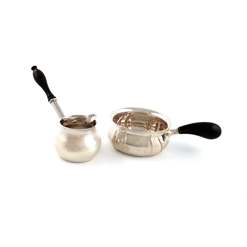 circular bellied form, with a turned wooden handle, length 15.2cm, approx. weight 2.8oz, plus a Danish silver brandy pan, Copenhagen 1949, assayer Johannes Siggaard, circular form, swirled decoration, tapering wooden handle, length 17.3cm, approx. weight 2.6oz. (2)