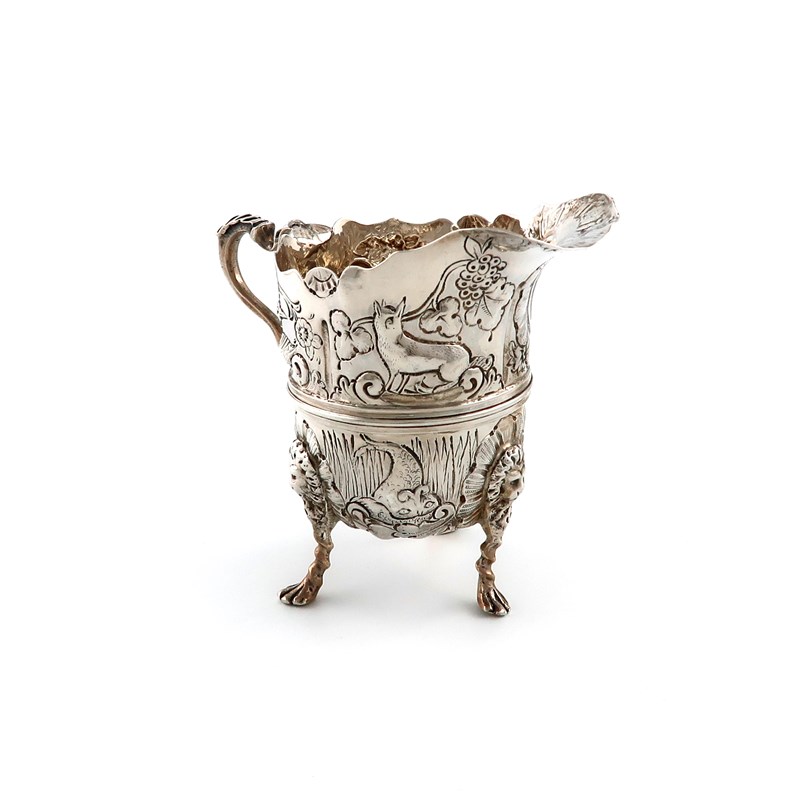 baluster form, embossed with birds and animals in a naturalistic setting, vacant cartouche, scroll handle, on three lion-capped twisted legs, height 9.8cm, approx. weight 5oz.