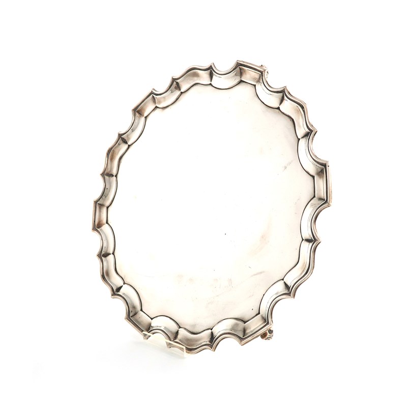circular form, moulded border, on three gnarl feet, diameter 35.8cm, approx. weight 32.5oz.