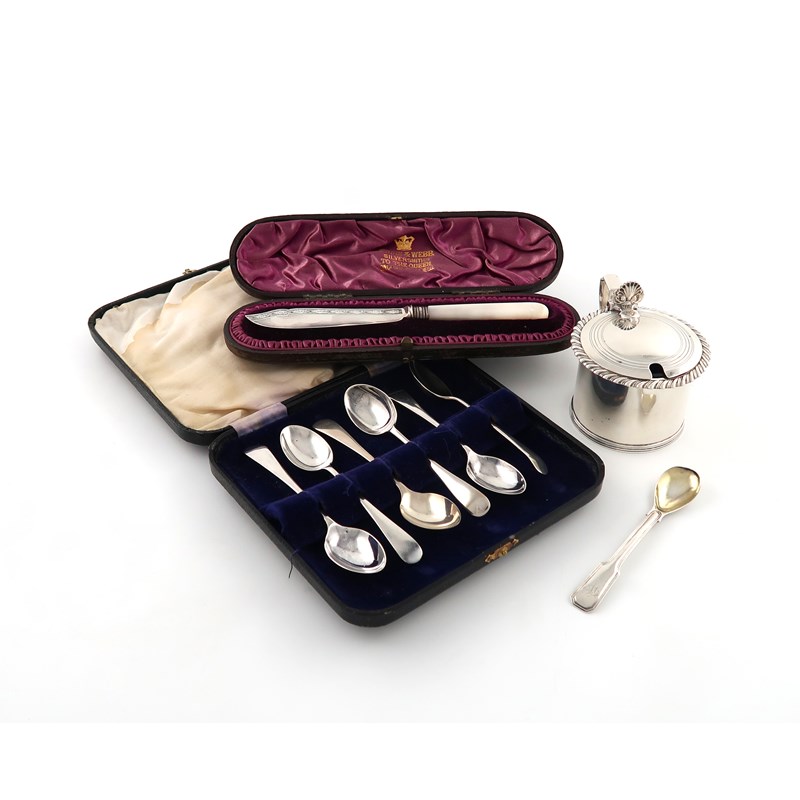 comprising: a George IV mustard pot, by Messrs. Lias, London 1829, circular form, gadroon border, scroll handle, with a blue glass liner, plus a condiment spoon, cased butter knife, and a set of six cased teaspoons, approx. weighable 2.7oz. (4)