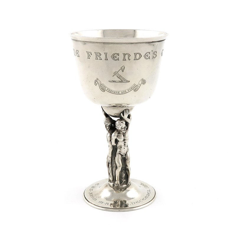 tapering circular bowl, engraved with a crest and motto and inscribed 'A True Friende's Guifte', on a stem modelled as three cast semi naked classical men, on a raised circular foot, inscribed 'E.B.S from M.H.A. 25 December 1898', height 15.5cm, approx. weight 8.5oz.