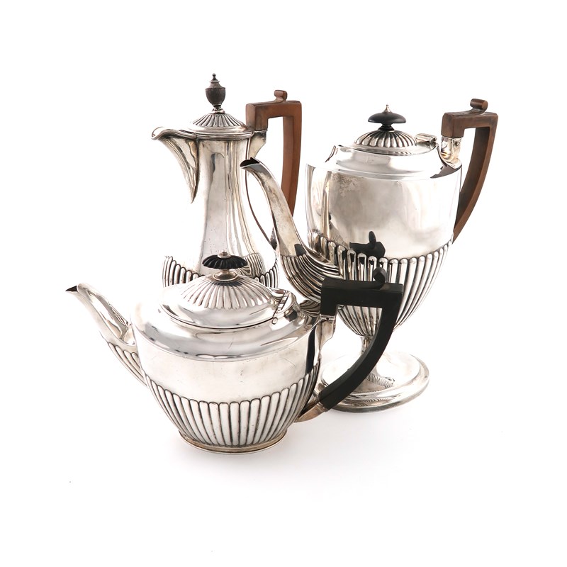oval form, part-fluted decoration, scroll handle, on a raised oval foot, plus a hot water pot of baluster fluted form, Sheffield 1893, and a teapot, by Elkington and Co., Birmingham 1894, approx. total weight 52oz. (3)