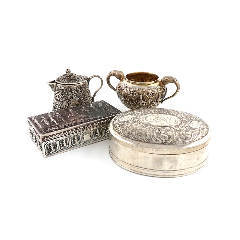 comprising: an Indian covered jug, of tapering oval form, chased foliate scroll decoration, on a matted background, scroll handle, the hinged cover with an animal finial, plus an Indian sugar bowl, with simulated elephant head scroll handles, a box of rectangular form, the cover and sides with figural decoration, and an oval box with foliate decoration, the cover initialled and inscribed, approx. total weight 955g. (4)