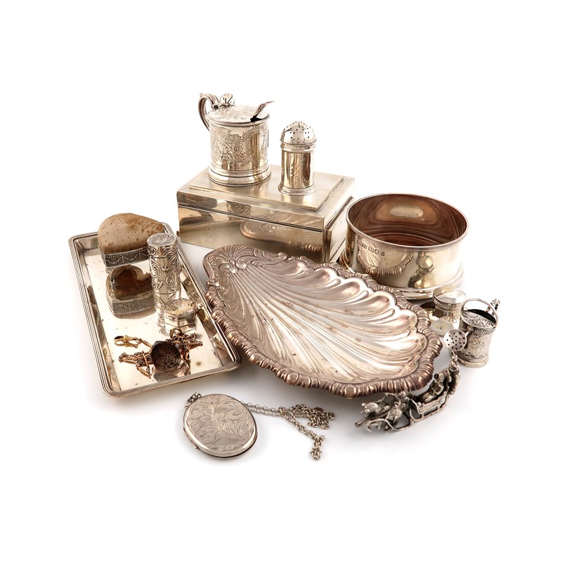 comprising: a Victorian mustard pot, by Joseph Angell, London 1856, a modern coaster, a shell dish, a pen tray, a cigarette box, a miniature watering can, a kitchen pepper, a cotton holder, an inkwell, miniature sledge, a locket, a box, a heart-shaped pin cushion, a pill box and a gold-mounted revolving smoky quartz fob seal, with three faces, engraved with an armorial and crest, with a chain, approx. weighable 23oz, weight of chain 10g. (qty)