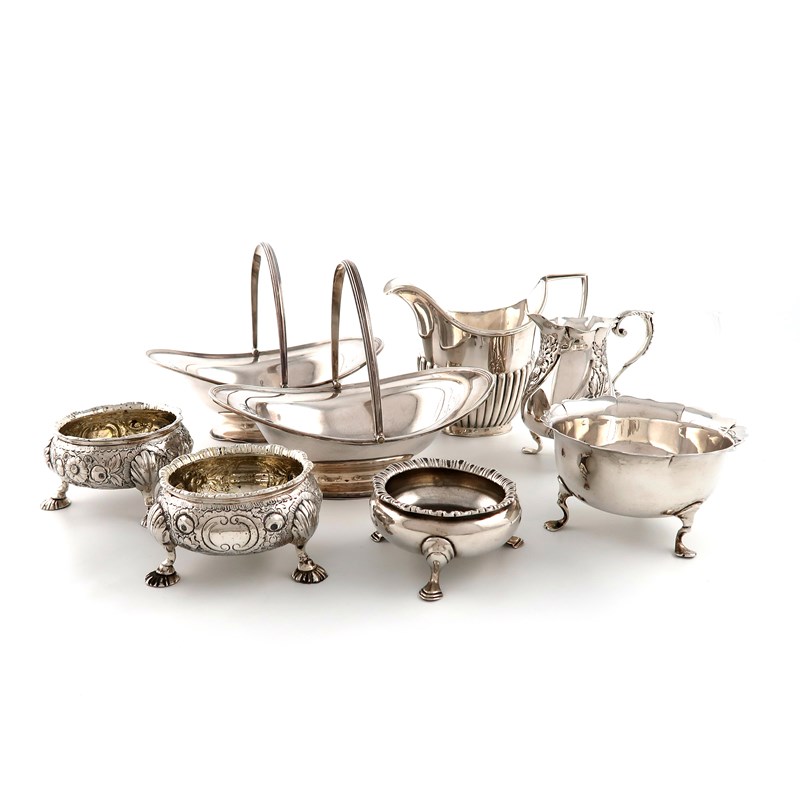 comprising: a matched pair of George II salt cellars, London 1754 and 1757, circular form, embossed with foliate decoration, a further salt cellar, lacking liners, a pair of swing-handled sugar baskets, by Atkin Brothers, Sheffield 1901, oval form, reeded border, a baluster cream jug, another cream jug, and a sugar bowl, approx. weight 29oz. (8)