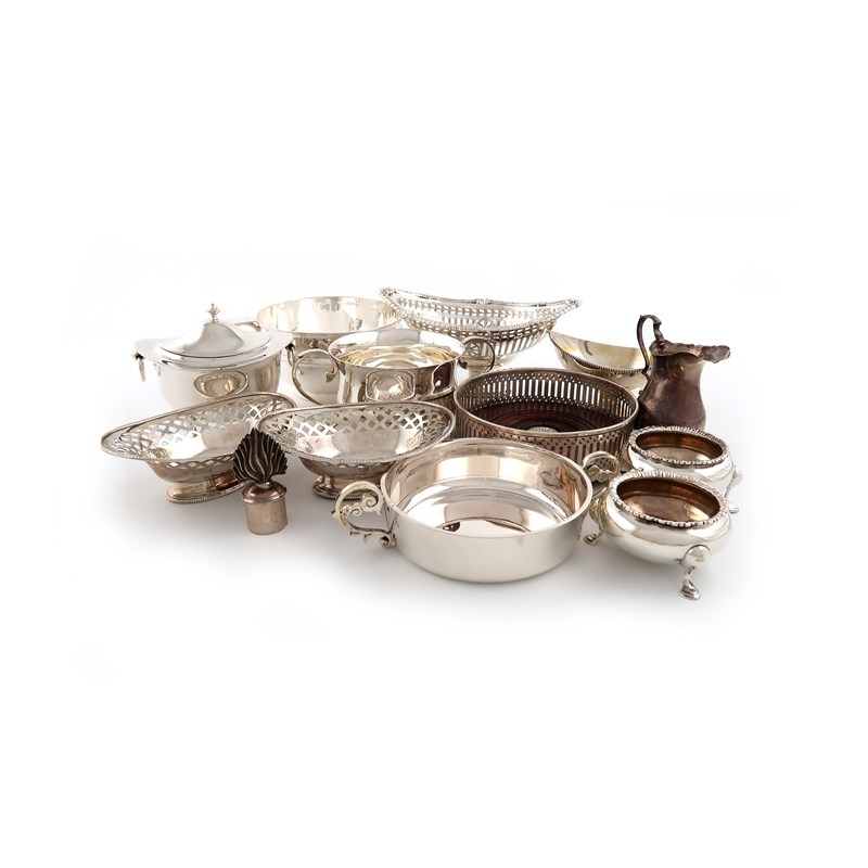 comprising: an Edwardian tea caddy, Birmingham 1904, oval form, drop-ring handles, a pierced oval basket, London 1897, a pair of small pierced baskets, a pair of salt cellars, a George III oval salt cellar, three two-handled bowls, a cream jug, a wine coaster and a finial, approx. weighable 41oz. (qty)