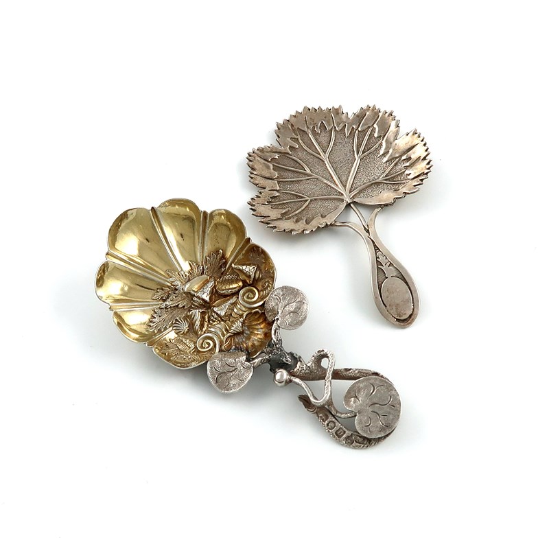 vine leaf shaped bowl, plus a Victorian silver caddy spoon, by Hilliard & Thomason, Birmingham 1852, gilded bowl embossed with shells, pierced lily pad tendril handle, approx. weight 0.7oz. (2)