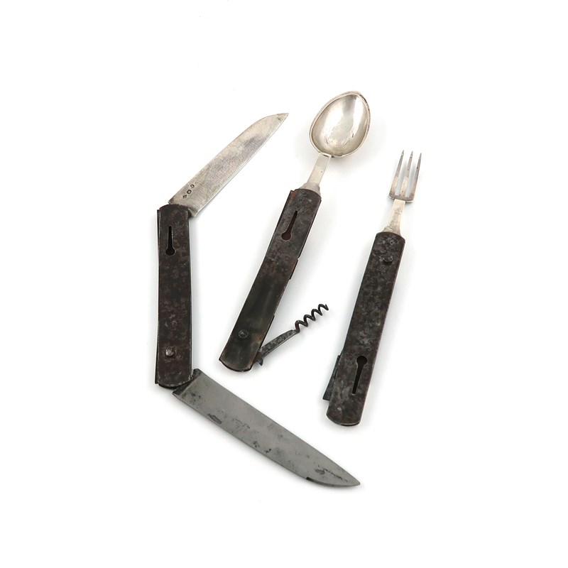 comprising a folding fork, spoon and knife, the knife with a silver blade and a steel blade, the spoon handle with a corkscrew, the three pieces clip together, with shield cartouches, length of spoon 23.7, length closed 13.8cm.
