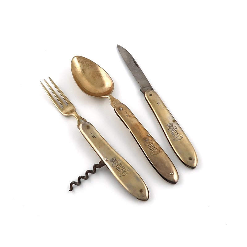 plain tapering handles, engraved with a monogram under a coronet, the bowl and tines fold away, the pen knife with a steel blade, length of fork open 17.5cm, length closed 10.2cm, in later wooden case. (3)